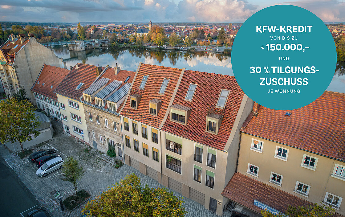 Unser »MainDUO« bietet ein ideales Fundament für Förderungen und Zuschüsse. Denn auch wenn es so gut wie neu ist, handelt es sich um eine Bestandsimmobilie mit hochwertiger energetischer Sanierung. Dadurch ergibt sich ein finanzieller Vorteil durch einen verbilligten Kredit sowie einen Tilgungszuschuss der KfW. Konkret heißt das: Die »MainDUO« Sanierungsmaßnahmen zielen auf das Erreichen des KfW 55 EE-Standards samt WPB („Worst Performing Building“) ab. Dies ermöglicht je Wohneinheit einen Kredit zum vergünstigten Zinssatz von bis zu 150.000 Euro. Dazu kommt ein Tilgungszuschuss von exakt 30 Prozent der Kreditsumme – also bis zu 45.000 Euro.