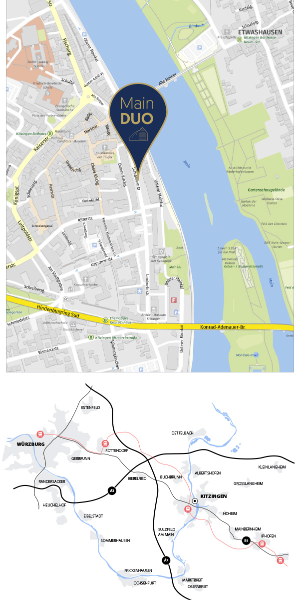 Das »MainDUO« liegt direkt zwischen Schrannenstraße und dem Mainkai inmitten der Kitzinger Altstadt. Das bedeutet nicht nur ein herrliches Ambiente, sondern auch die unmittelbare Nähe zum Main und all den anderen Dingen, die das Leben und den Alltag schöner und komfortabler machen. Ob Einkauf oder Restaurantbesuch, Kino und Kultur, Schwimmbad oder das ehemalige Gelände der Landesgartenschau – hier wirft sich Ihnen alles Gute buchstäblich vor die Füße. Insgesamt gibt es in Kitzingen jede Menge Grünflächen und Freizeitangebote sowie Konzerte und Veranstaltungen. So zelebriert sich das Leben tatsächlich wie von selbst. Und auch die Gesundheitsversorgung findet hier vollumfänglich durch Ärzte und Krankenhaus statt. Kurz: Kitzingen ist groß genug für beste Lebensqualität und klein genug für Nähe und Miteinander.